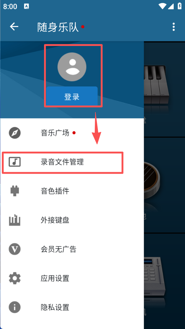 4、打开侧边栏菜单,能找到录音文件管理选项,登录账号后,可在此处对已创作的音频文件进行管理操作。