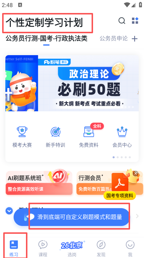 1、进入 “练习” 页面,可查看个性定制的学习计划,滑到底端能自定义刷题的模式与题量,适配备考节奏。