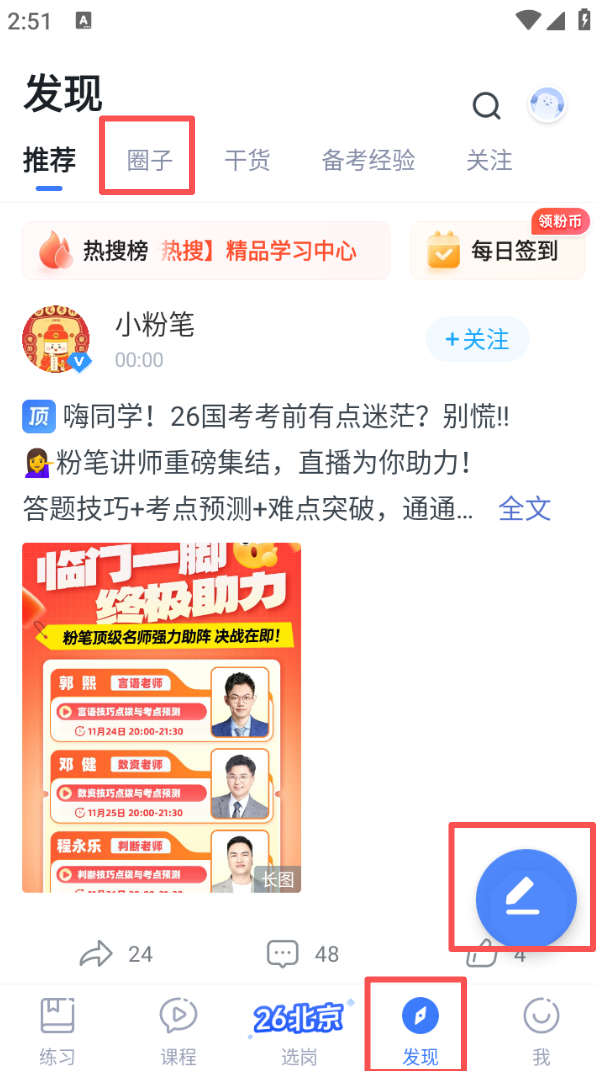 2、切换到 “发现” 页面,点击 “圈子” 分类,可浏览备考相关内容,还能通过编辑按钮发布个人动态。