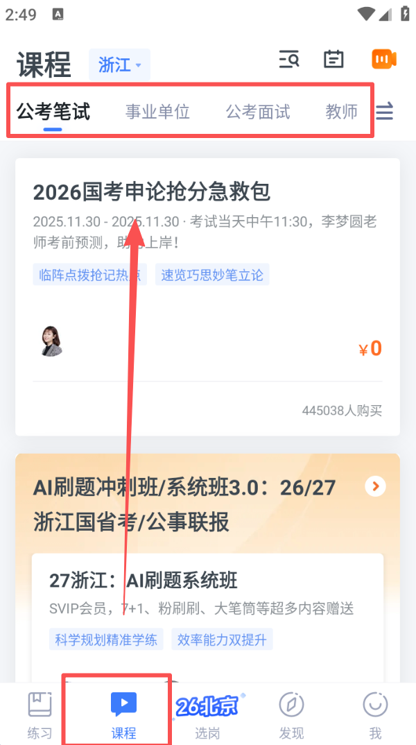 3、打开 “课程” 页面,选择 “公考笔试” 分类,能查看适配的申论、AI 刷题等课程,按需选择学习内容。