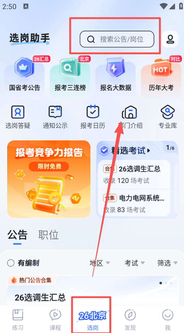 4、进入 “选岗” 页面,通过搜索框查找公告或岗位,借助选岗助手工具辅助确定报考的目标岗位。