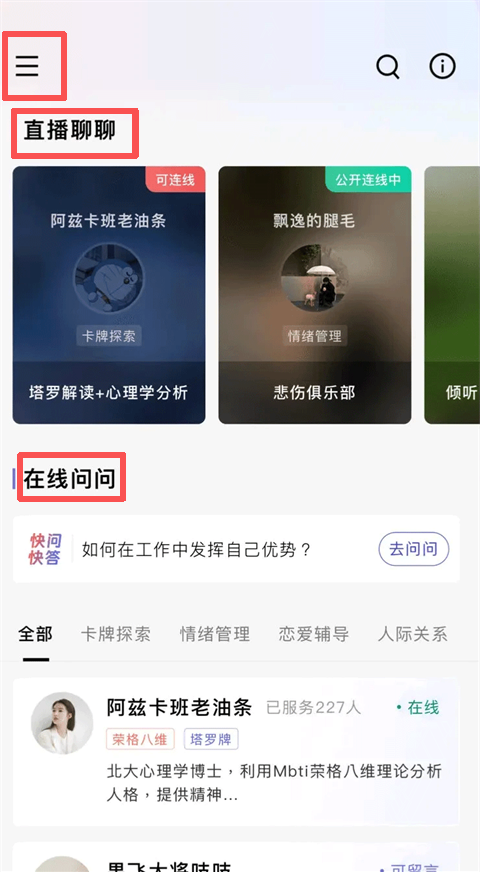 3、点击页面左上角的菜单按钮,展开后可看到 “直播聊聊”“在线问问” 等板块,点击即可进入对应互动区域。