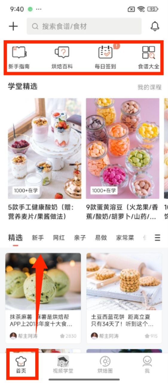 1、进入首页,顶部能看到新手指南、烘焙百科等功能入口,下方学堂精选板块有各类烘焙课程,还可按分类筛选食谱。