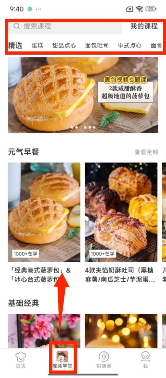 2、点击底部 “视频学堂”,页面会展示蛋糕、甜品点心等课程分类,同时能查看元气早餐、基础经典类的烘焙课程。