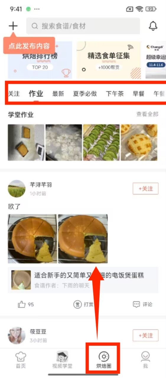 3、切换到 “烘焙圈” 页面,这里有作业、最新等内容分类,可浏览其他用户分享的烘焙作品,还能参与内容发布。
