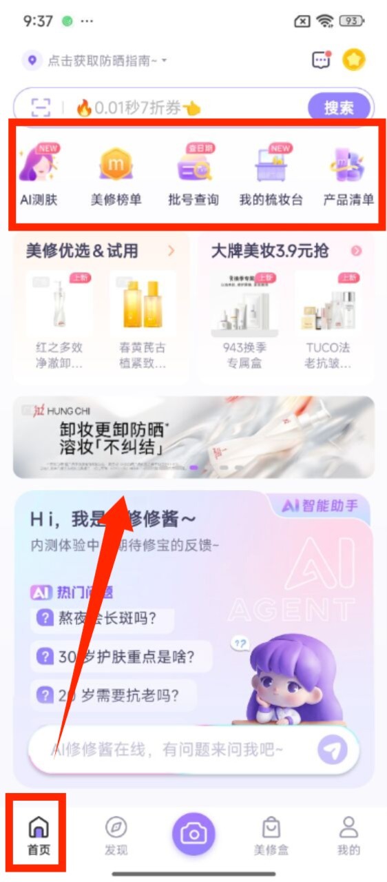 1、进入首页,顶部能看到 AI 测肤、美修榜单等功能入口,下方还有美妆试用与优惠活动可供浏览。