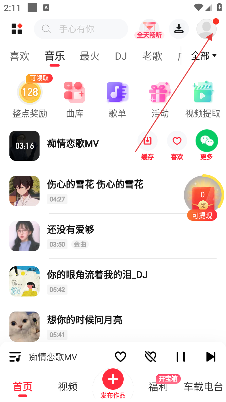 1、在快音APP首页,点击右上角个人头像图标,进入个人页面。