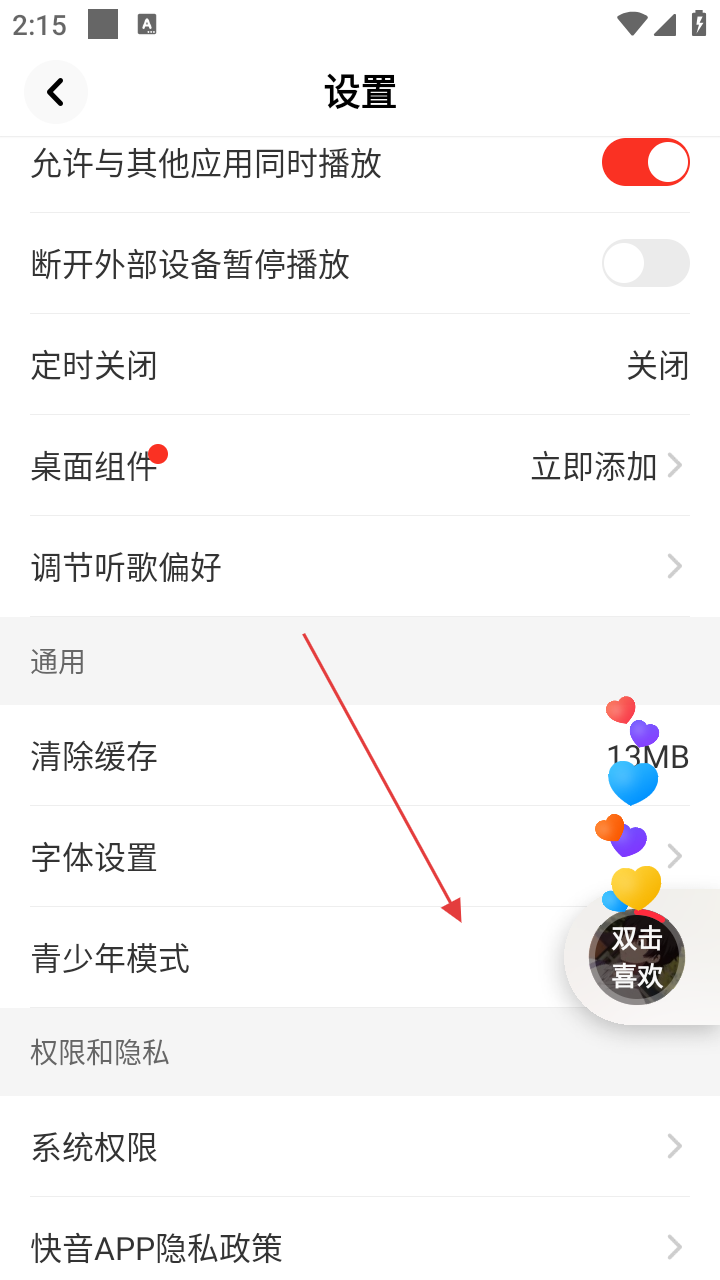 3、在设置页面,点击【青少年模式】选项,进入青少年模式页面。