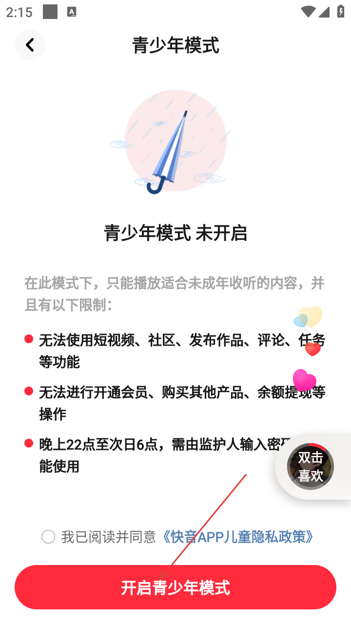 4、在青少年模式页面,勾选同意《快音APP儿童隐私政策》后,点击【开启青少年模式】按钮,按照提示设置密码,即可开启青少年模式。