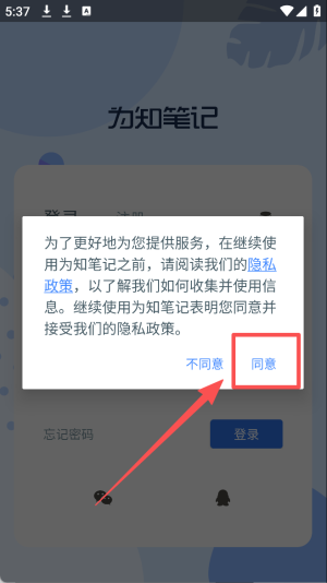 1、同意隐私政策:在登录界面阅读并同意隐私政策,点击“同意”继续。