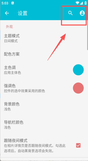 3、进入设置选择主题模式为日间并自定义主色调和导航栏颜色。