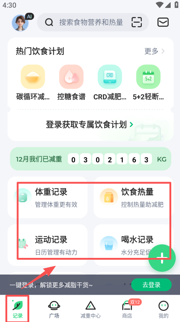 1、进入记录页面,选择体重、饮食热量等记录选项,开启体重管理、热量控制等相关操作。