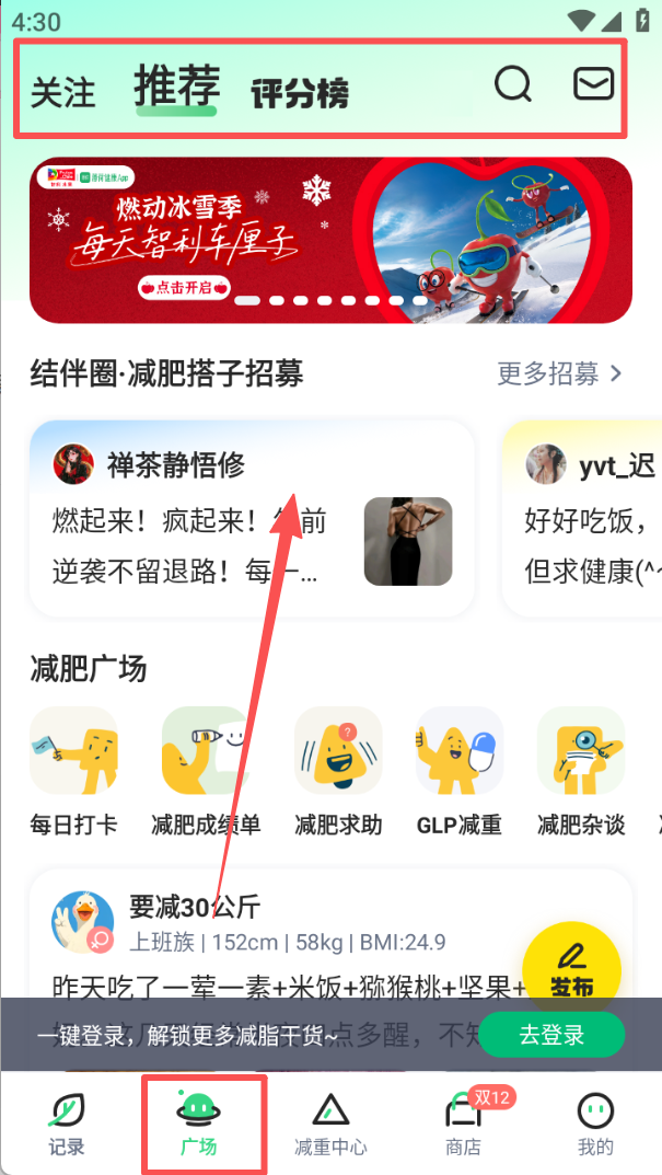 2、切换到广场页面,在推荐板块浏览减肥搭子招募、减肥广场等内容,参与减脂相关互动。