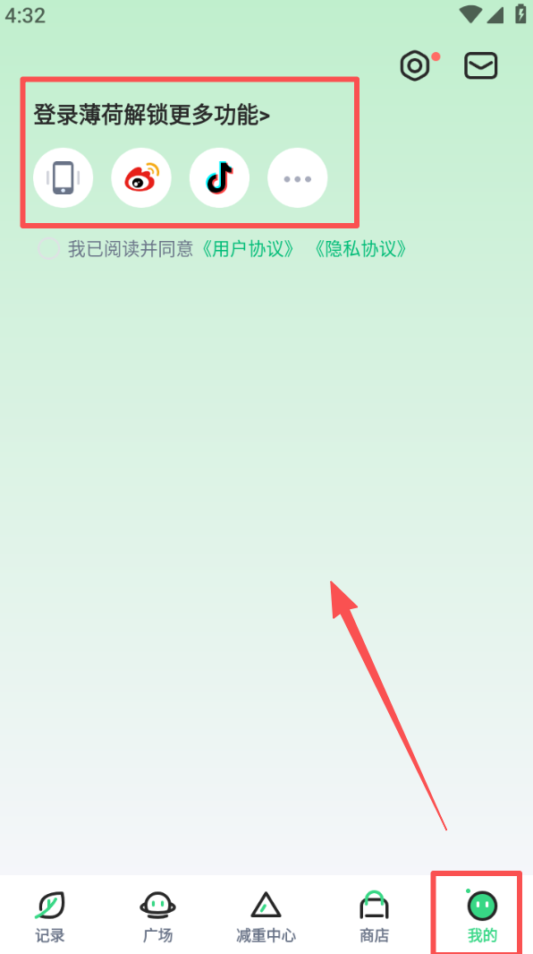 4、进入 “我的” 页面,选择手机、抖音等方式完成登录,解锁更多减脂相关的功能与服务。