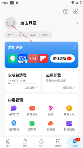 1、在应用推荐页可浏览游戏、软件资源,点击底部【管理】进入个人管理界面,可进行应用更新、清理等操作。