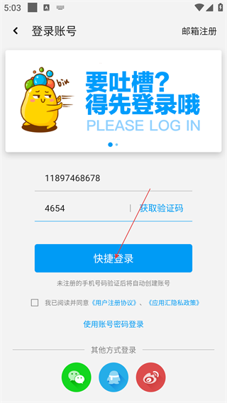 4、填写完手机号与验证码后,勾选相关协议,点击“快捷登录”按钮即可完成账号登录,未注册手机号会自动创建账号。