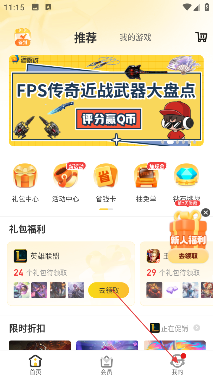 1、在游戏平台首页,可浏览推荐游戏、礼包福利、限时折扣等内容,点击【我的】进入个人页面。