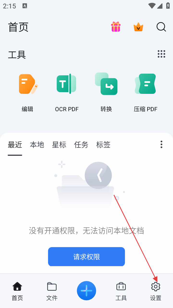 1、在万兴PDF首页,可使用编辑、OCRPDF、转换、压缩PDF等工具,点击【设置】进入设置界面。