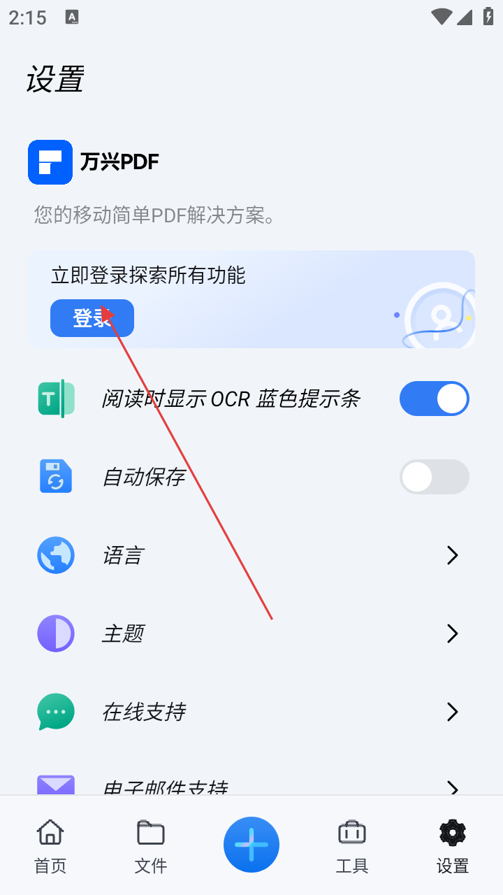 2、在设置界面,点击【登录】进入登录页面,还能对阅读时显示OCR蓝色提示条、自动保存、语言等进行设置。