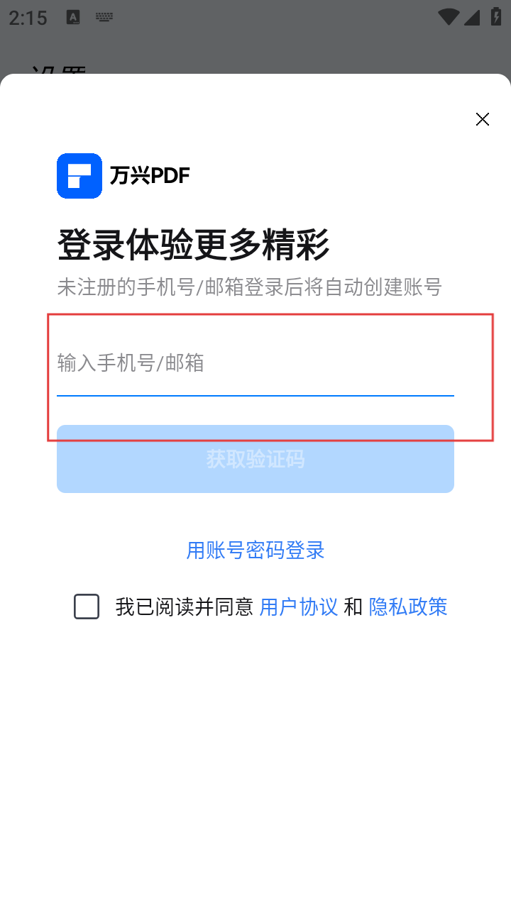 3、在登录页面,输入手机号/邮箱,勾选同意用户协议和隐私政策。