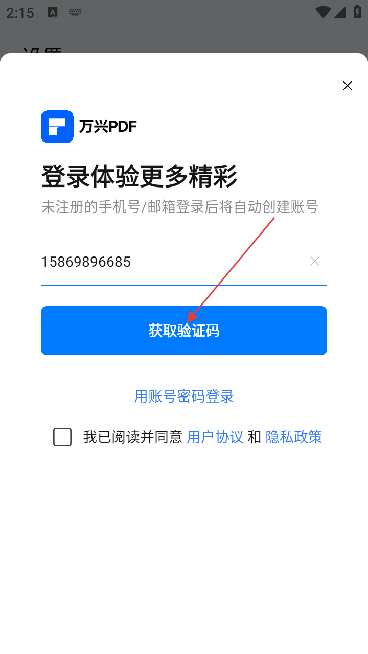 4、输入完成后,点击【获取验证码】,输入验证码后即可完成登录,体验万兴PDF的全部功能。