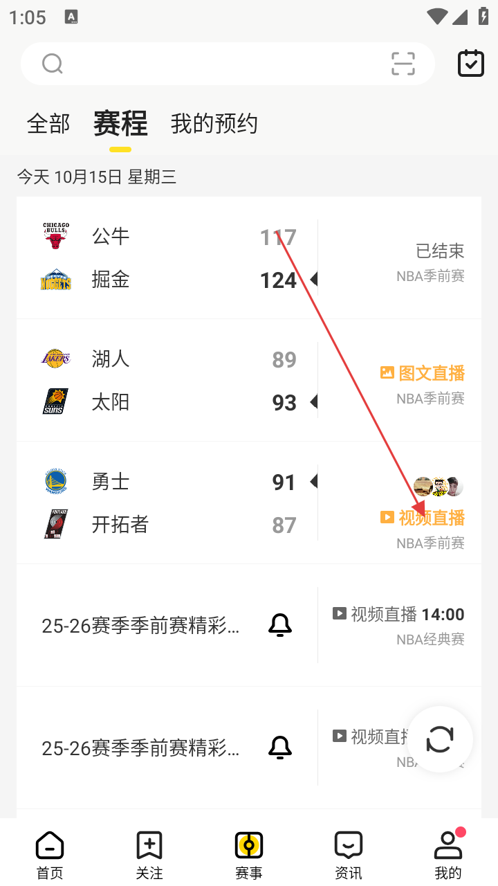 2、进入赛事页面后,找到【视频直播】标识的赛事,点击进入直播选择界面。