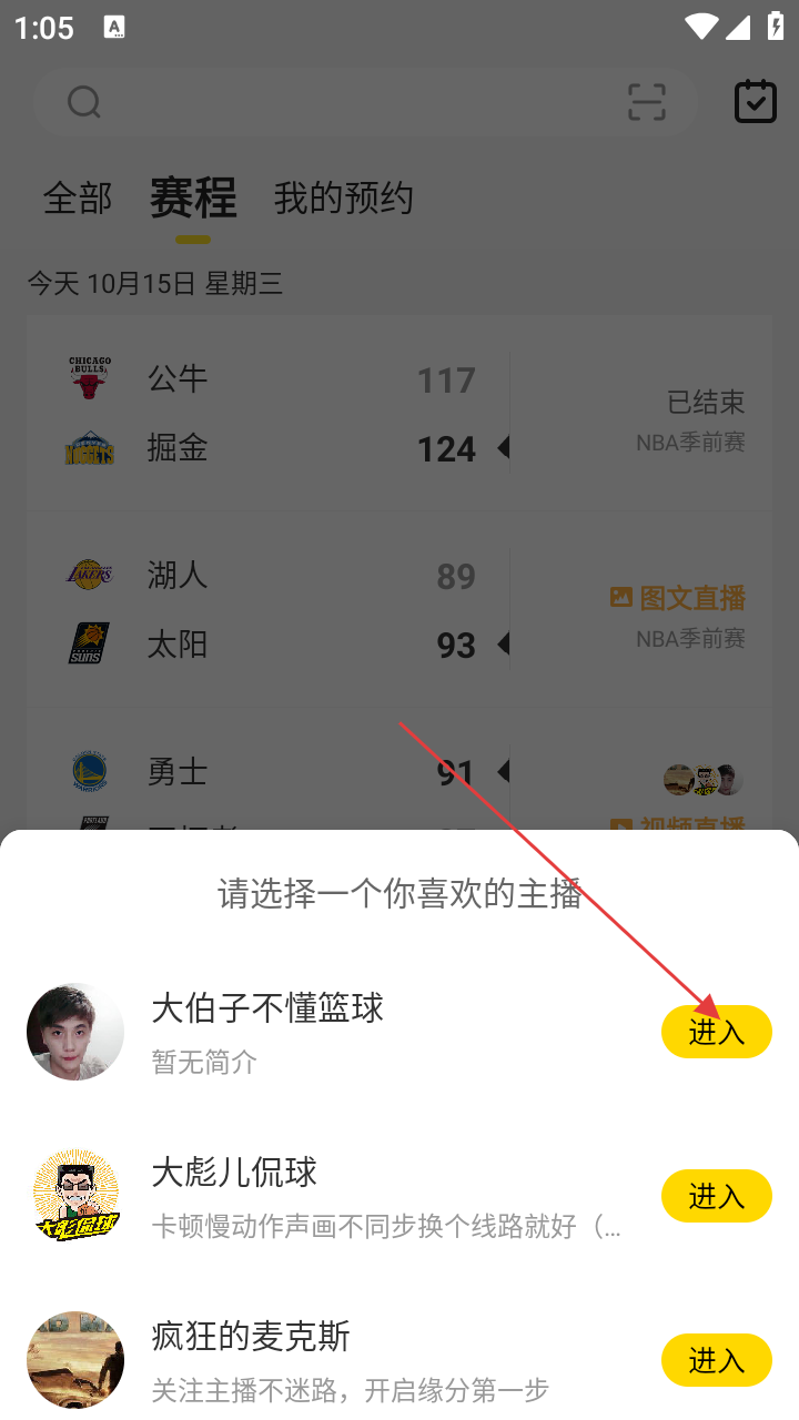 3、在直播选择界面,选择喜欢的主播,点击其对应的【进入】按钮,进入直播间。