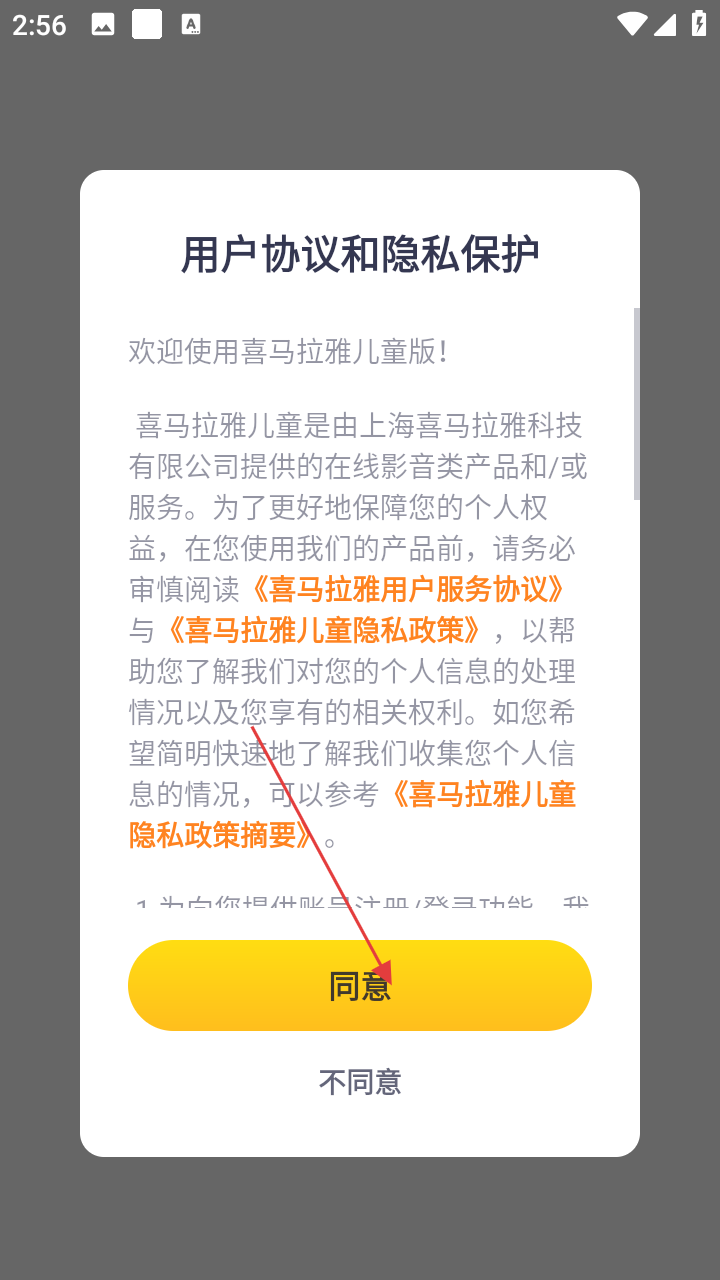 1、使用喜马拉雅儿童版前,需阅读【用户协议】和【隐私保护】相关内容,了解后点击【同意】进入。