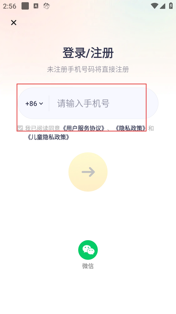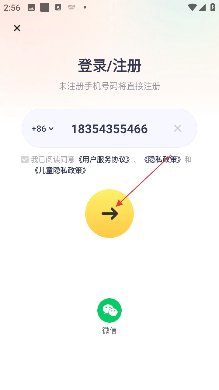 4、输入手机号后,勾选同意相关协议,点击黄色箭头按钮,即可继续登录流程。