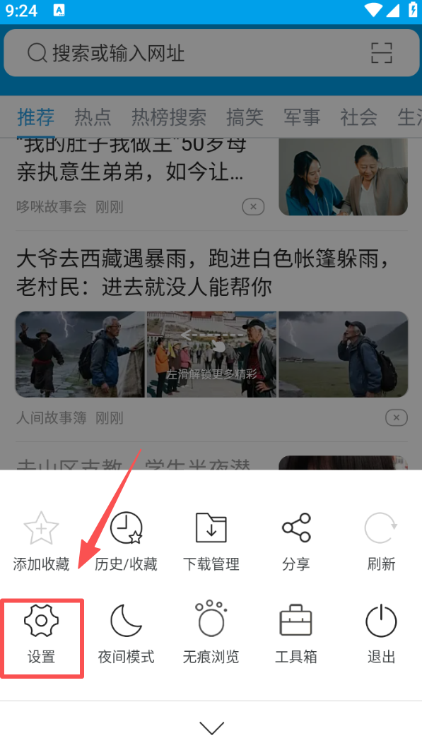 2、点击功能菜单,找到设置选项并进入,能对浏览器进行个性化配置。