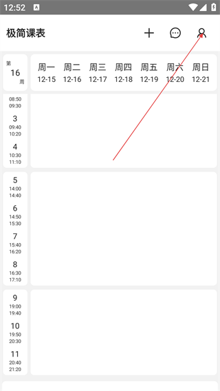 1、在“极简课表”主界面,点击右上角的个人中心图标,进入个人中心页面。