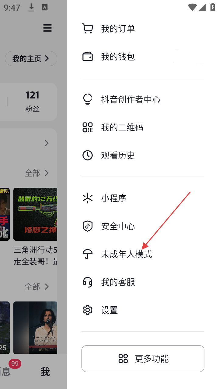 3、在功能菜单中,找到并点击【未成年人模式】选项,进入未成年人模式设置页面。