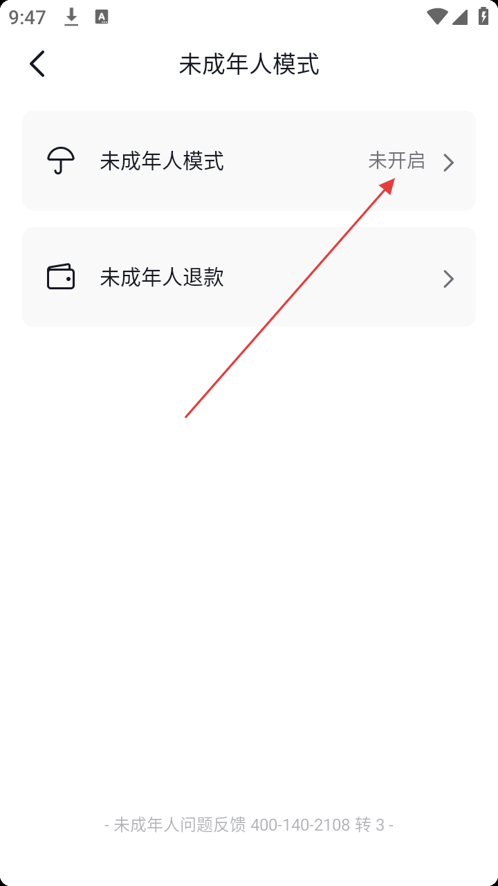 4、在未成年人模式设置页面,点击【未成年人模式-未开启】选项,进行未成年人模式开启操作。