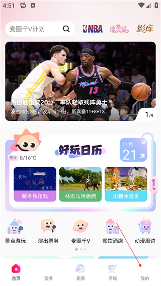 1、打开软件,首页有【NBA】【精灵爱】【影库】等板块,还有【景点游玩】【演出票务】等功能入口,点击底部【我的】。