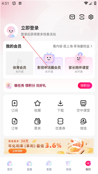 2、进入个人页面后,找到【立即登录】入口,登录后可参与更多活动并使用会员等功能。