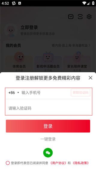 3、进入登录注册界面,选择手机号验证码登录方式,需输入手机号和验证码,且要同意《用户协议》和《隐私政策》。