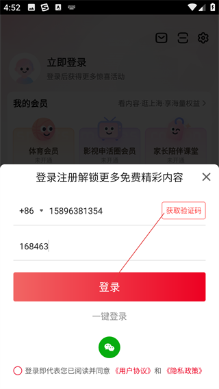4、在登录注册页面,输入手机号后点击【获取验证码】,填入验证码后点击【登录】按钮即可完成登录操作。