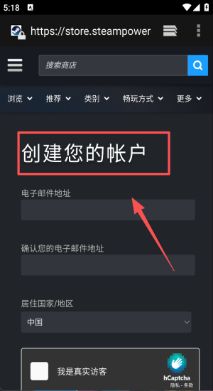 2、跳转注册页填写邮箱与国家,勾选人机验证后提交创建新账户。