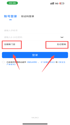 1、登录或注册:点击“登录”按钮进行账号登录,或点击“注册新门店”进行注册。