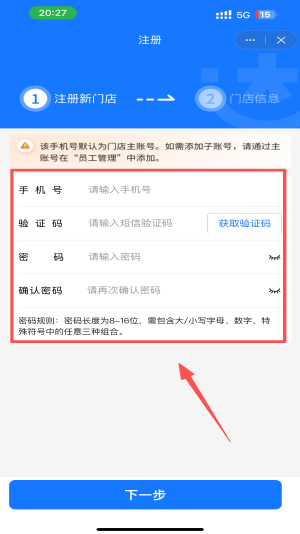 2、填写注册信息:输入手机号、验证码和密码,点击“下一步”继续注册流程。