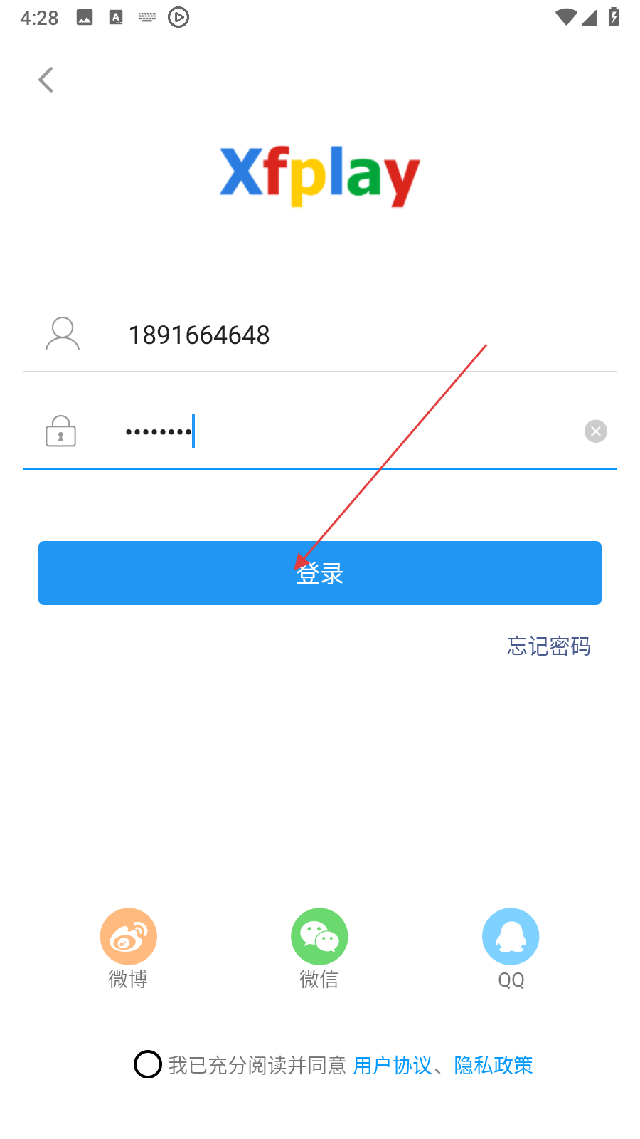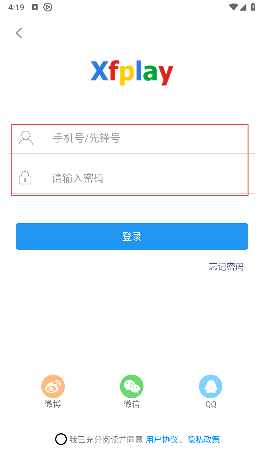 3、在登录页面输入手机号/先锋号和密码,勾选【我已充分阅读并同意《用户协议》《隐私政策》】。