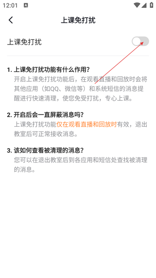 4、在“上课免打扰”页面,可通过开关按钮开启该功能,同时该页面包含功能作用、生效范围、消息查看方式的说明。