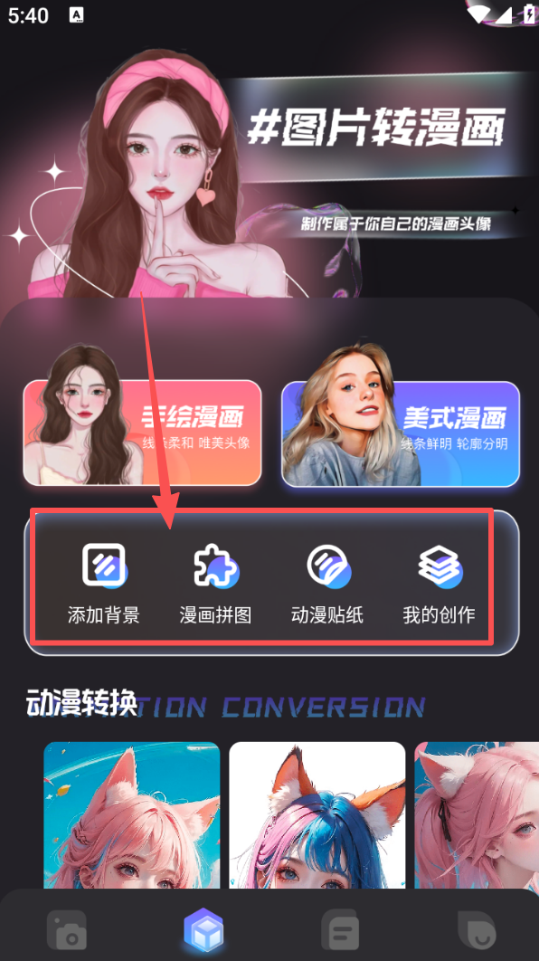 2、切换到创作页面,通过 “添加背景”“漫画拼图” 等功能,可对素材进行编辑加工。