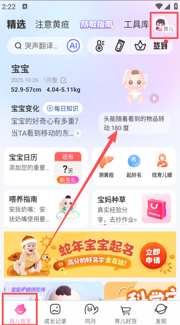 1、进入育儿管家页面,可查看宝宝的成长数据,也能在 “宝宝变化” 板块了解每日对应的育儿知识。