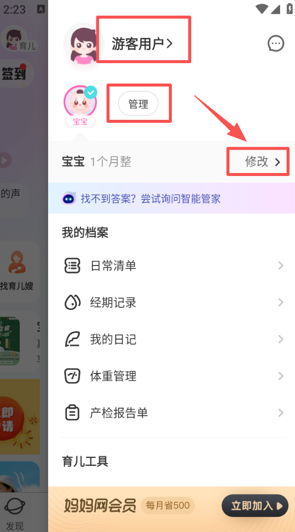 2、点击右上角育儿入口,进入个人页面后,选择 “管理” 选项,再点 “修改” 进入宝宝资料编辑界面。