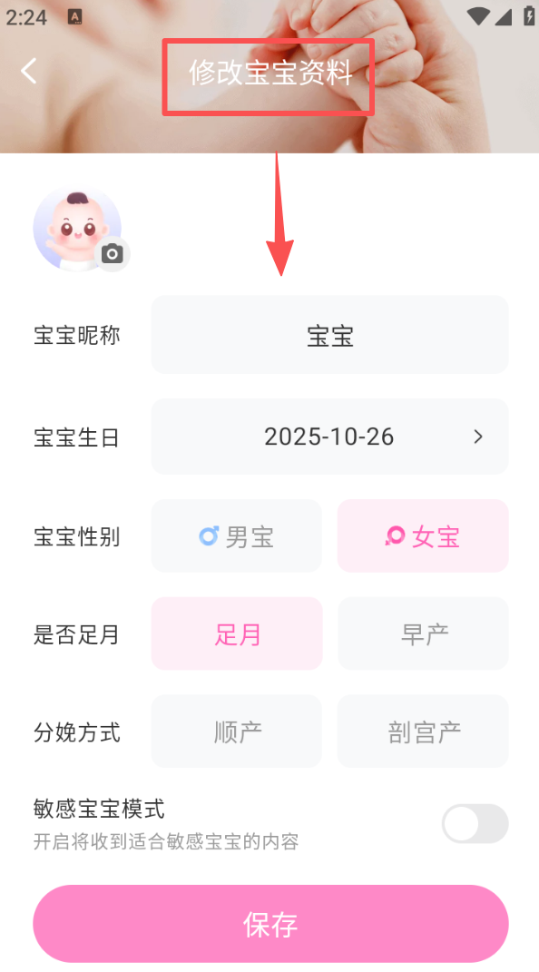 3、在修改宝宝资料页,可调整昵称、生日、性别等信息,确认后点击 “保存” 完成资料的更新。