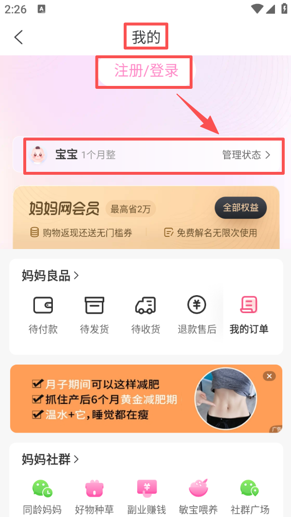 4、切换到 “我的” 页面,点击 “注册 / 登录” 完成账号操作,可管理宝宝信息、查看会员权益等内容。