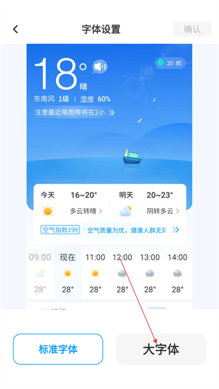 4、在字体设置页,点击“大字体”选项切换字体样式,再点击右上角“确认”按钮,完成字体调整并生效。