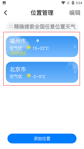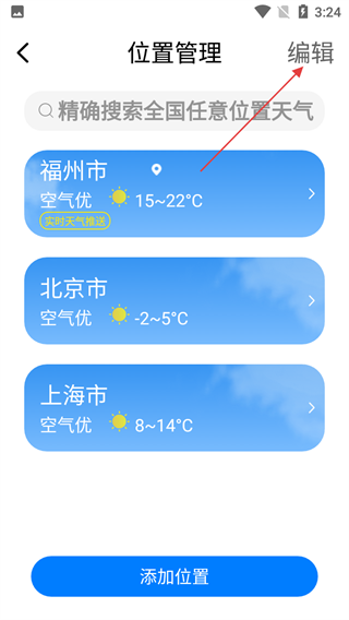 2、在个人中心页,进入“位置管理”界面,点击右上角“编辑”按钮,进入位置编辑模式。