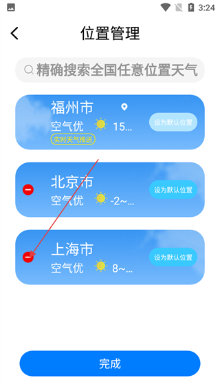4、操作完成后,点击底部“完成”按钮,确认编辑结果,位置管理页将移除该城市,完成位置删除流程。